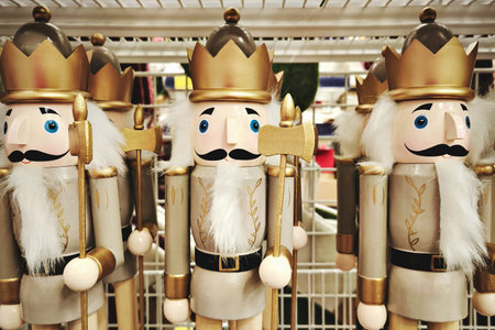 Closeup of wooden white and gold nutcracker kings with mustache and uniforms, warm festive feel