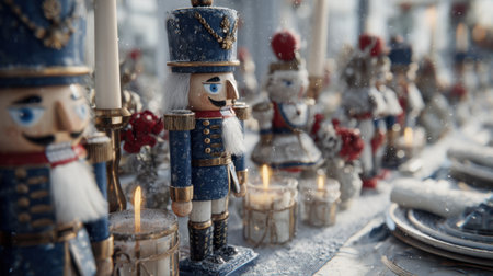 A beautifully arranged festive table featuring charming nutcracker figurines, glowing candles, and vibrant decorations, perfect for holiday celebrations.