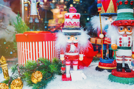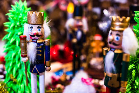 Nutcracker toy, Santa Claus and other Christmas souvenirs on the holiday new year winter fair. Christmas decoration