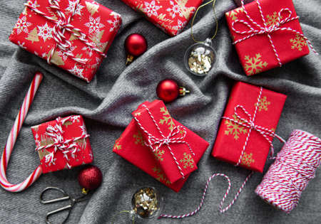 Different Christmas gift boxes on grey cotton background