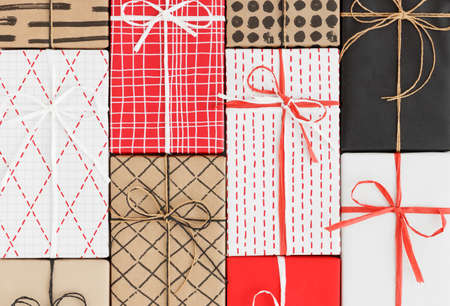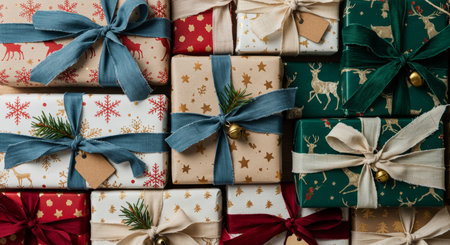Christmas gifts wrapped in kraft paper and tied with ribbons.