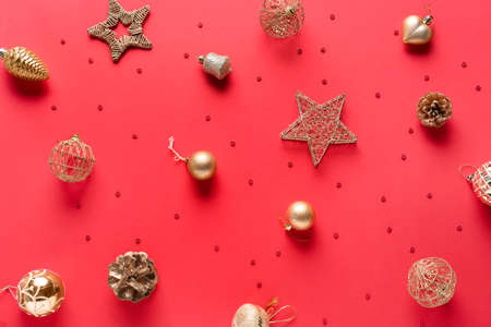 Christmas red background with christmas decoration, gold decoration, top view