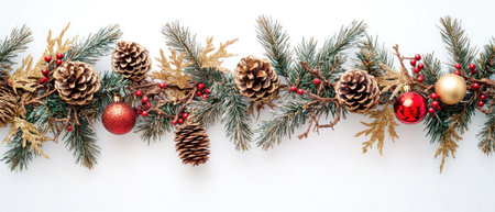 Christmas garland with pine cones, paper background, gold and red decorations, cinnabar accents, festive atmosphere, white backdrop, high resolution, detailed texture, in the style of commercial photography, wide-angle shot. --ar 7:3 --v 6.1 Job ID: 31dd451d-88bb-4cef-b2a2-71642556309f