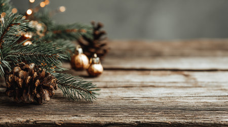 Green branch of pine tree, pine cones and Christmas decorations on rustic table. Bokeh