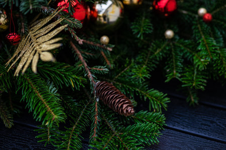 Christmas background with fir branches and baubles on dark wooden board