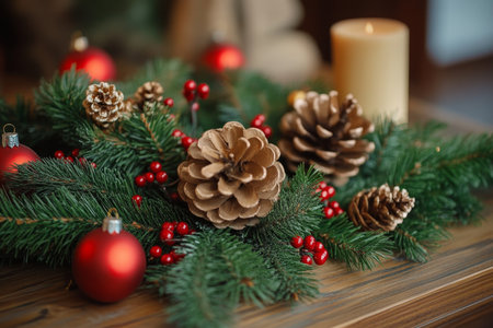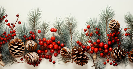 Festive pine cone and red berries on evergreen branches creating a holiday atmosphere.