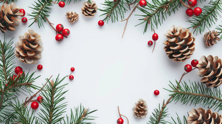 Spruce cones, pine needles and red berries on Christmas white background Poster with copy space