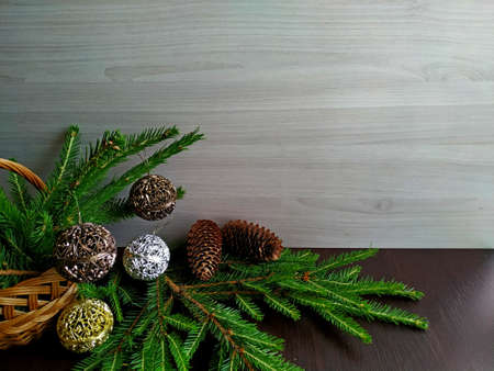 wicker basket with fir branches decorated with golden and silver Christmas balls. copy space
