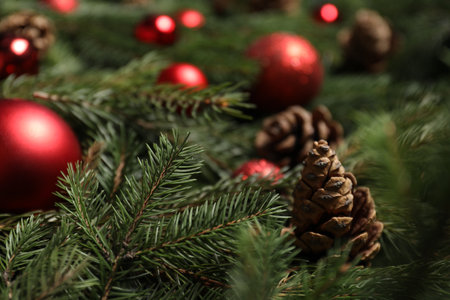 Beautiful spruce tree branches with cones and Christmas ornaments as background, selective focus