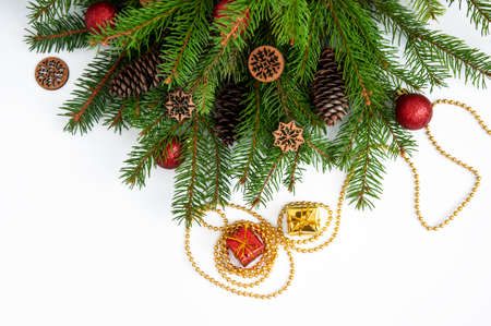 Christmas fir branch with new year decorations isolated on white background. Place to write.