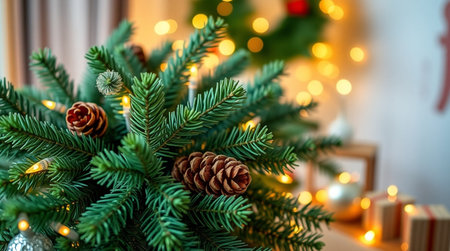 Christmas decoration with fir branches, pine cones and lights on the background