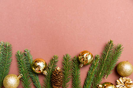 Golden Christmas balls, pine cones and fir branches on a brown background space for text. Christmas and New Years composition
