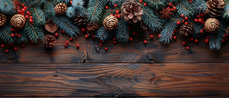 Fir branches on wooden background with cones and New Years decorations. Christmas banner. Space for text.