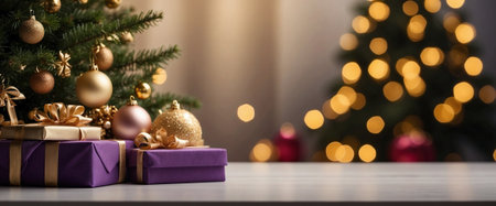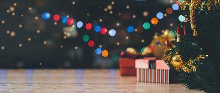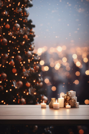 Wooden table mockup with christmas fir tree and decoration. Bokeh background with copy space