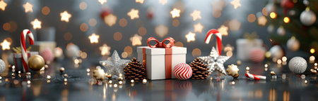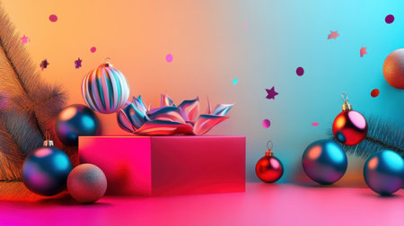 A vibrant arrangement of Christmas decorations features colorful ornaments a gift box and festive elements against a striking backdrop.