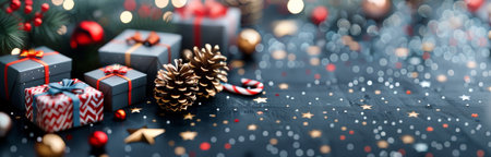 Colorful gift boxes adorned with ribbons are arranged among pinecones and holiday ornaments on a dark surface, creating a cheerful festive atmosphere filled with sparkling bokeh and holiday spirit.