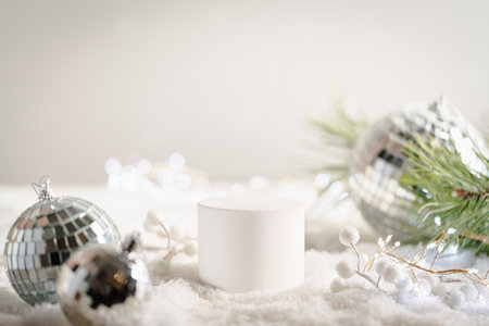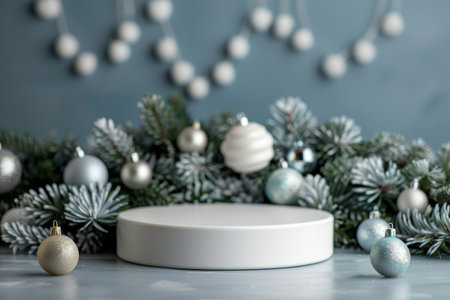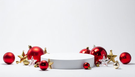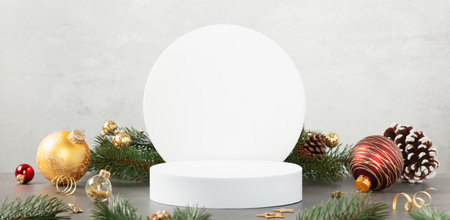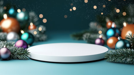 Product display podium in the foreground, copy space, with christmas theme. Generative AI.