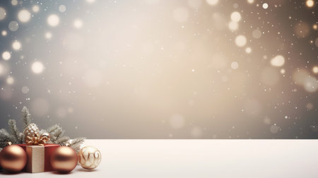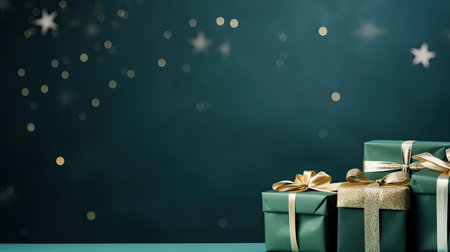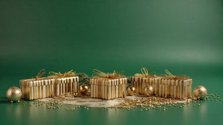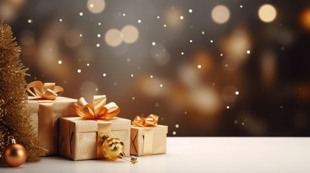 Elegant and Festive Background Design Featuring an Array of Gifts, Gold Spheres, and Glitters