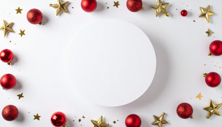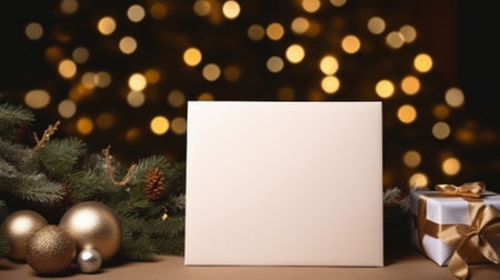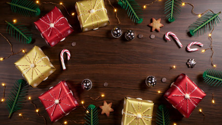 A top-down view of a beautiful Christmas flat lay with presents, fir branches, and shiny balls, providing ample space for a festive message or creative design.
