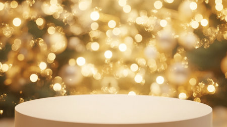 A festive display featuring a round pedestal against a backdrop of sparkling golden lights