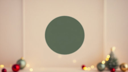 Green circle overlay on a Christmas background with lights and ornaments. Festive design with copy space for holiday banners and cards