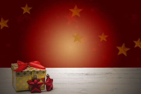 Festive Red Christmas Gift and Baubles on Wooden Table