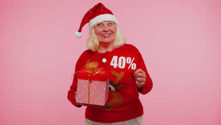 Mature grandmother in Christmas sweater showing gift box, 40 Percent discount inscriptions banner text. Black Friday. Good holiday low prices for shopping. Blue studio wall background. Happy New Year