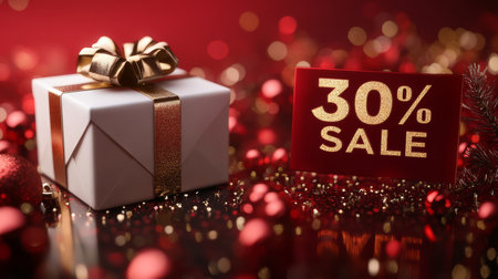 Red Christmas Sale Background, White Gift Box With Gold Ribbon, Festive Bokeh Lights, 30 Percent Off