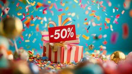 Festive gift box surrounded by colorful confetti during a promotional sale event