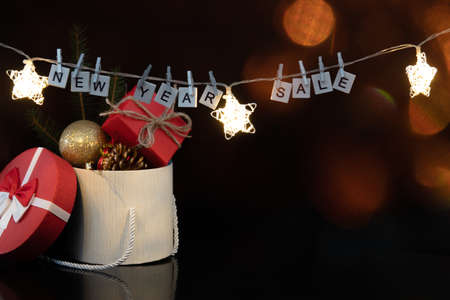 Lightbox with word Sale and Christmas decor on yellow background
