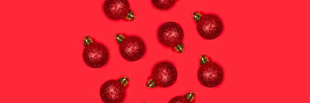 Christmas pattern with shiny red bauble ornament balls on vibrant red background. Creative Xmas or New Year celebration concept. Winter holidays idea. Flat lay, top view.