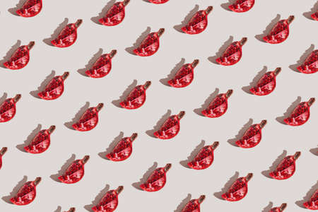 Fresh pomegranates on pastel gray background with sunlit. Minimal style. Top view. Flat lay.