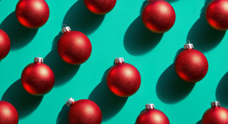 Bright red ornaments are neatly spaced on a vivid teal surface, casting long shadows that enhance the festive atmosphere, perfect for holiday decorations and seasonal celebrations.