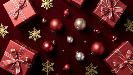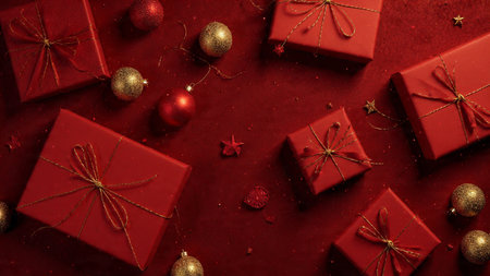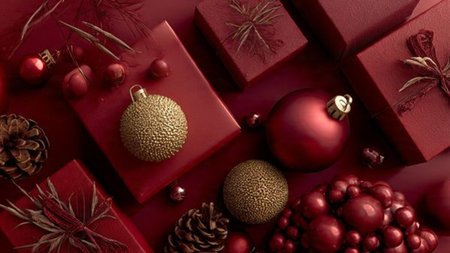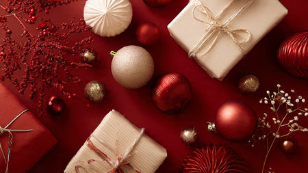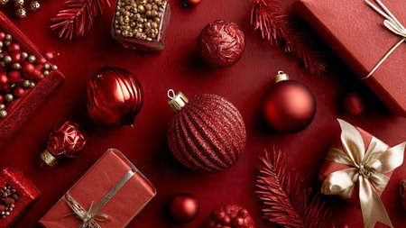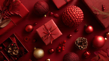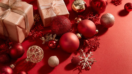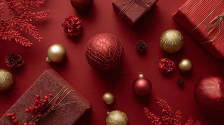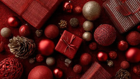 A vibrant and festive scene featuring colorful Christmas decorations, presents, and ornaments on a rich red background. Perfect for holiday themes.