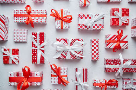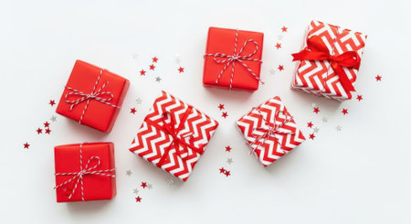 Overhead shot of red and white gift boxes with ribbons and confetti scattered on a white background, perfect for holiday themes.