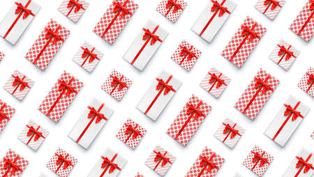Gift boxes isolated on white background. Pattern with present boxes, red ribbon and bow tie. 3d vector illustration. Template for celebration posters, banners, leaflets.