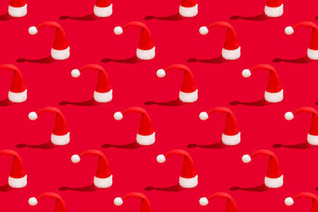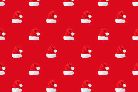 Christmas red Santa Claus hat on red background. New year or Christmas abstract pattern.