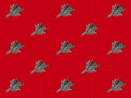 Red Christmas background. Fir tree seamless pattern. New Year party natural decor. Evergreen plant creative arrangement. Blue spruce twig minimalist symmetrical composition isolated on bright color.