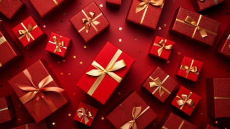 Red with golden Christmas gift boxes. Minimalistic festive background, horizontal web banner. A cardboard box with a surprise inside with a satin ribbon and a bow. Top view flat lay Generative AI