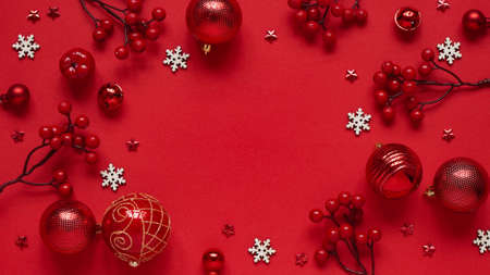Concept for New Year and Christmas banner.Christmas decor, red balls, berries, stars and white snowflakes on a red background, top view, flat lay, copy space.Christmas card with place for text, lettering.