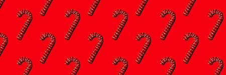 Christmas pattern made of red gift boxes, candy canes, decorations, balls on pink background. Christmas New Year, winter holidays concept.