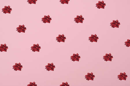 Christmas and new year pattern. Celebration picture. Pink background with red bright bows. Flat lay, top view.