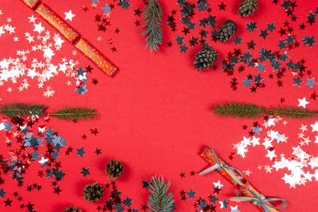 Christmas abstract pattern, flat lay. Fir tree branches, gift box, confetti in the form of star and cone on red background. Concept of New Year presents, festive and holiday shopping. Top view.