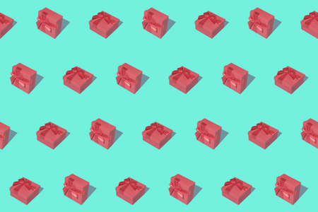 Seamless pattern of craft boxes with red ribbon bows. Valentine day concept. Trendy minimalistic flat lay design background in pop art style. Horizontal