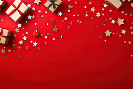 Top view of greeting card with holiday decorations, featuring Christmas gifts, star confetti, and re