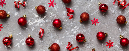 Banner with red Christmas balls on a bright background. The central composition, the decorations lie in the form of a circle.