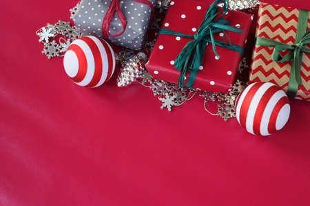 Different Christmas gift boxes with striped glass ball baubles and silver decoration on red background. Christmas festive background