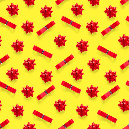 Seamless regular creative Christmas pattern with New Year decorations on yellow background. xmas Modern Seamless pattern made from christmas decorations. Photo quality pattern for fabric, prints, wallpapers, banners or creative design works.