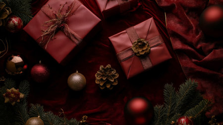 Overhead shot of exquisite gift boxes wrapped in deep red satin, accompanied by extravagant tree ornaments, on a dark burgundy backdrop with space for messages. The rich colors and luxurious decorations create a festive mood.
