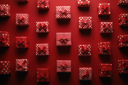 Small red Christmas gift boxes with white polka dots and red bows forming a seamless pattern on a red background
